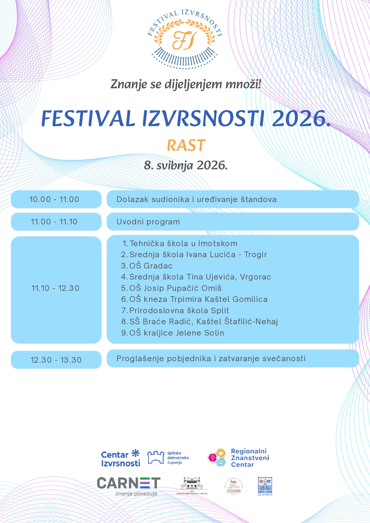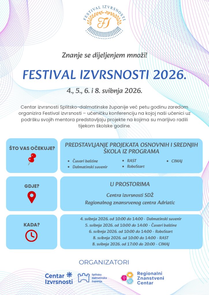 Petu godinu za redom CI SDŽ organizira Festival izvrsnosti – tradicionalnu učeničku konferenciju na kojoj će polaznici koji sudjeluju u izvannastavnim programima CI SDŽ sa svojim mentorima imati priliku jedni drugima, svojim roditeljima, rodbini, prijateljima i nastavnicima te široj javnosti predstaviti projekte na kojima su radili u ovoj školskoj godini.