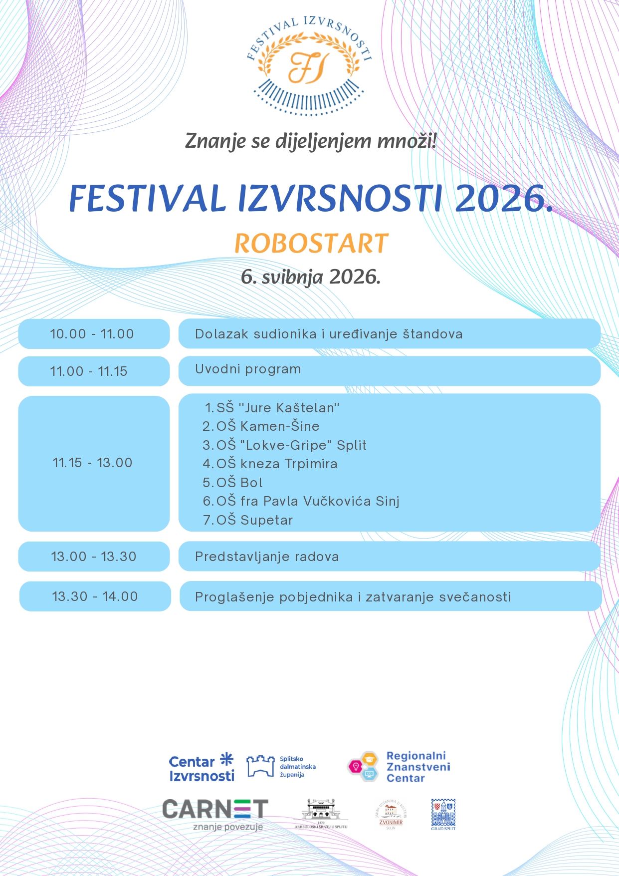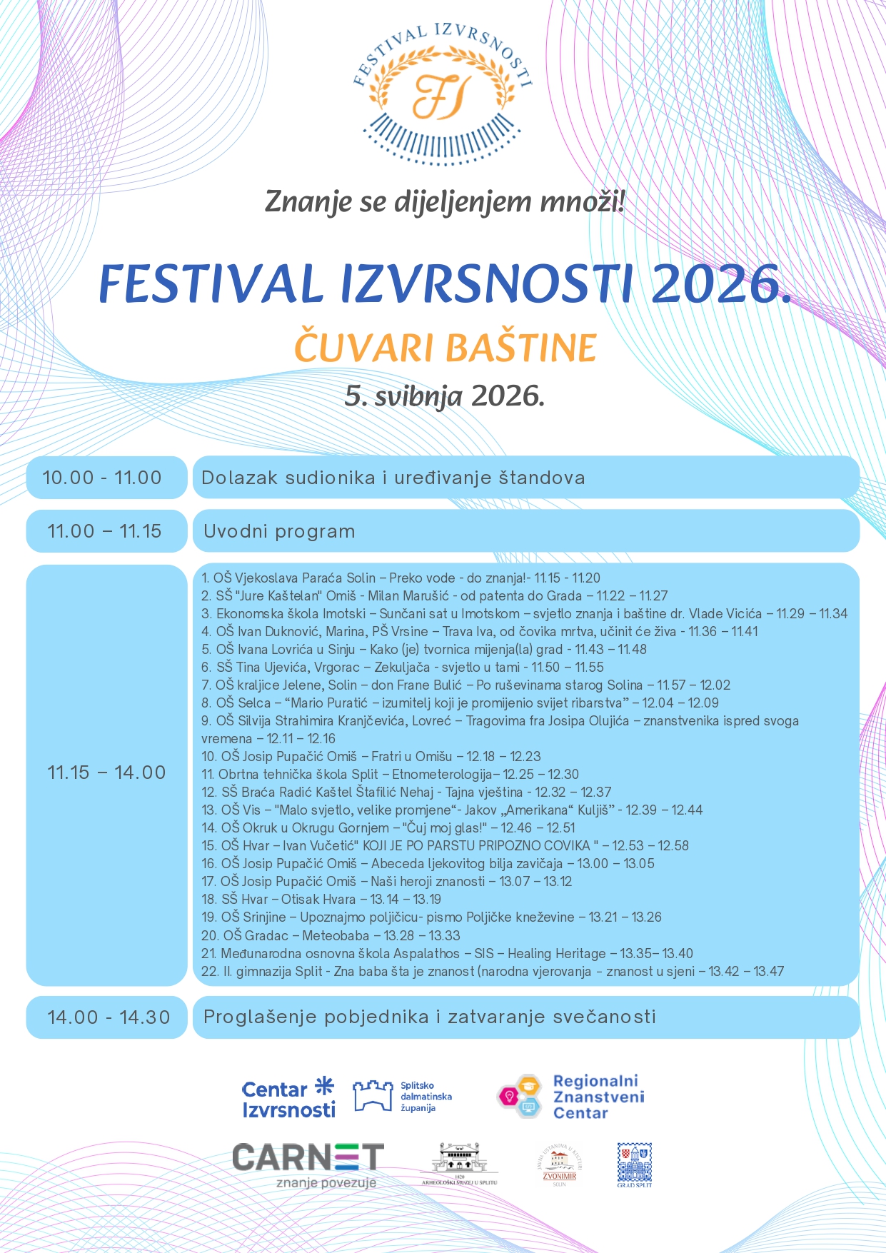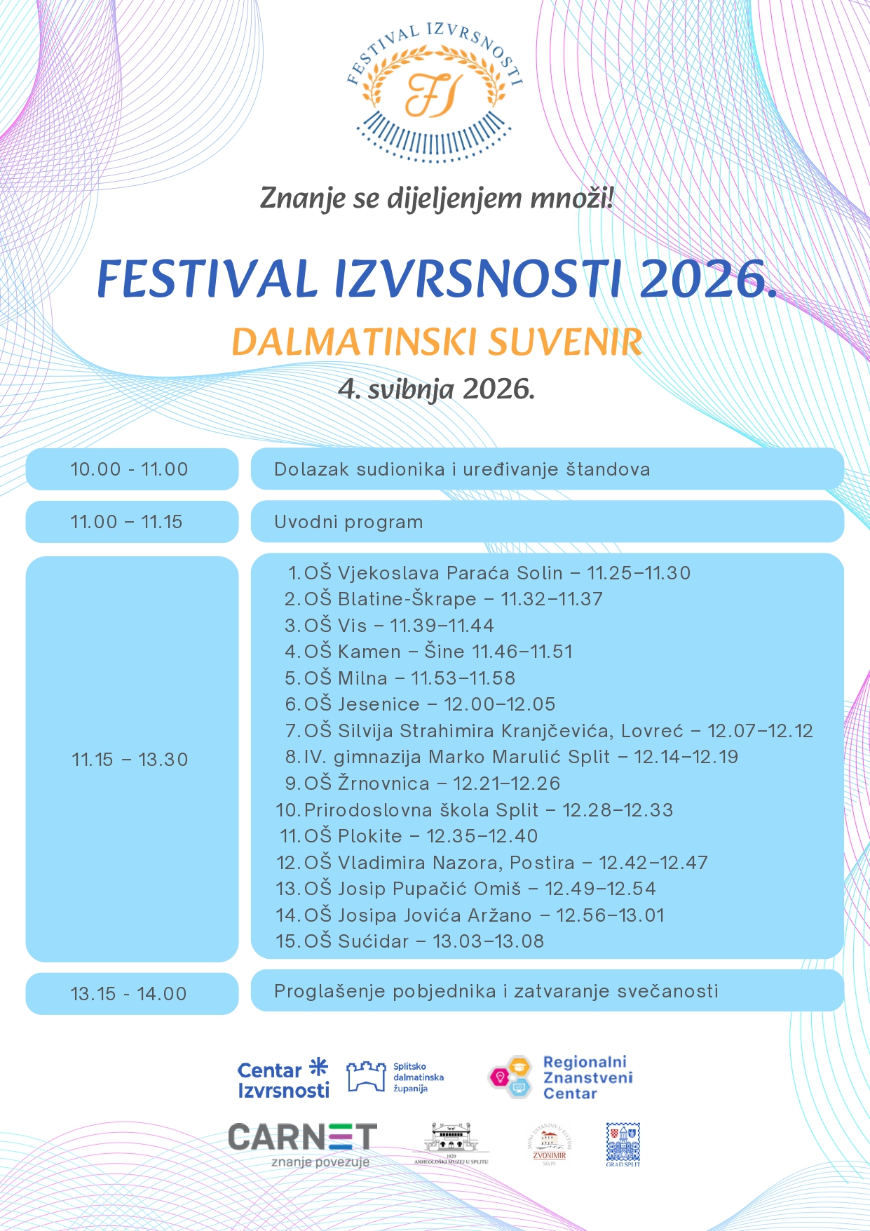 Na Festivalu će se predstaviti projekti osnovnih i srednjih škola unutar programa Čuvari baštine, Dalmatinski suvenir, RoboStart, RAST te CIMAJ.