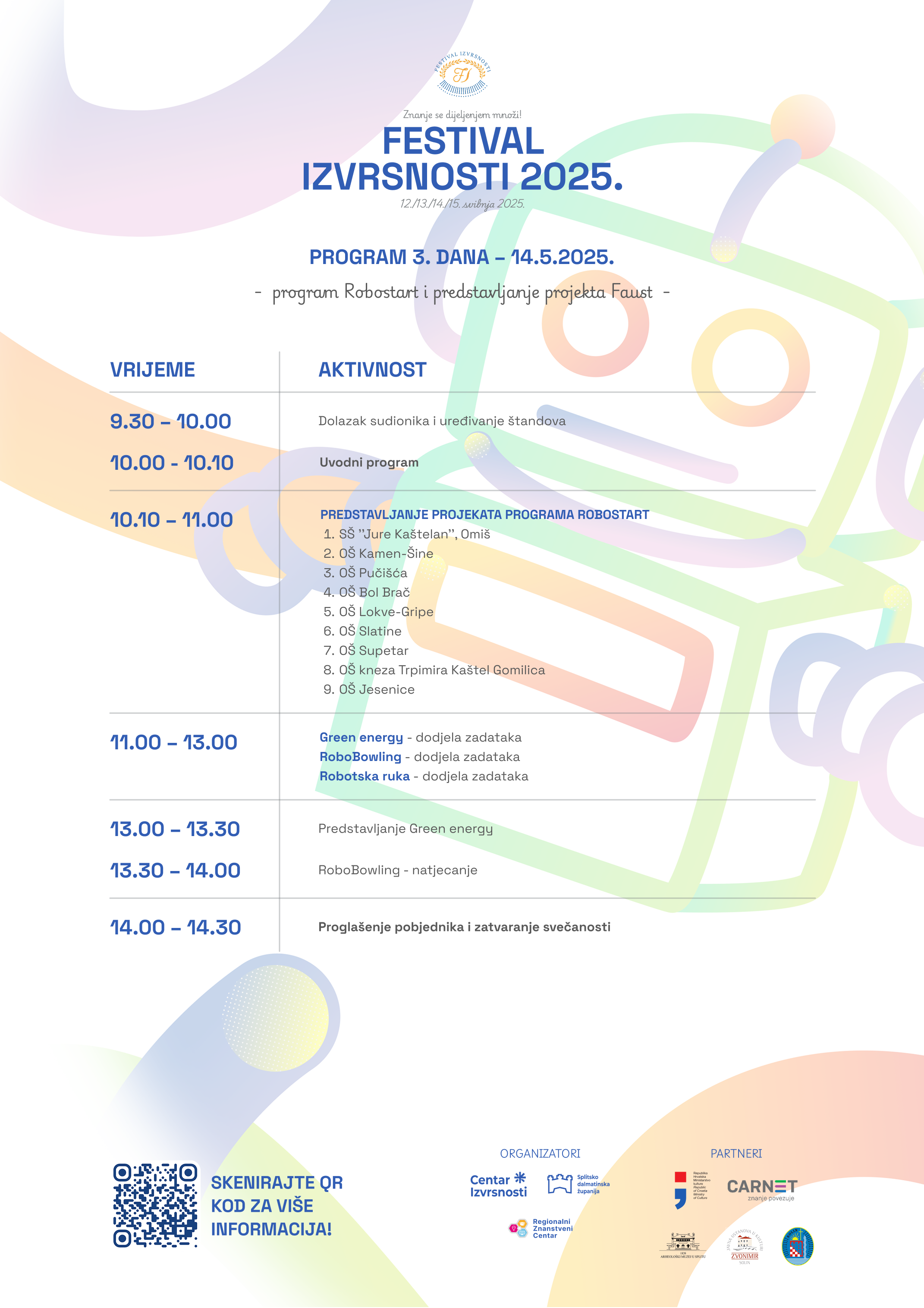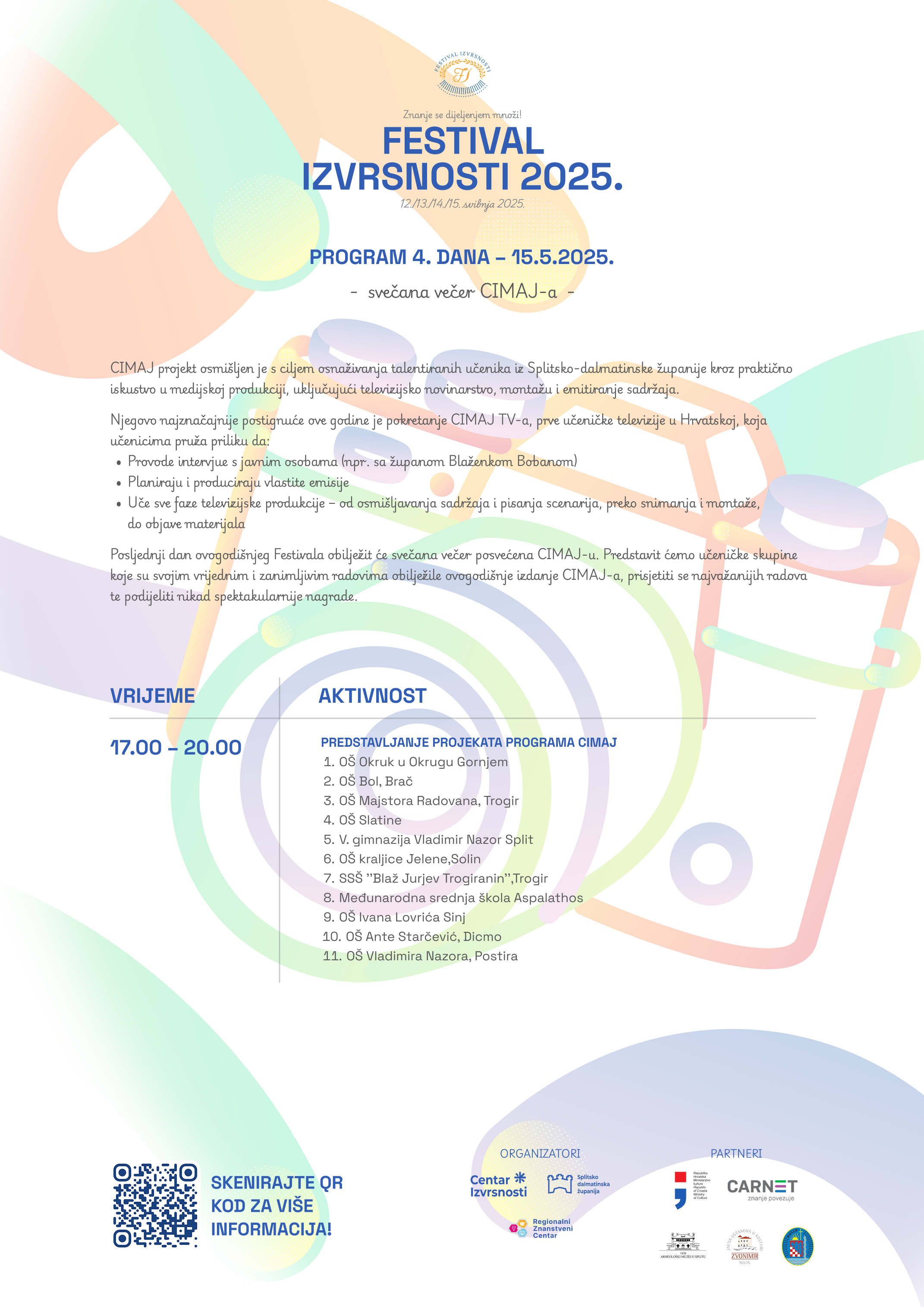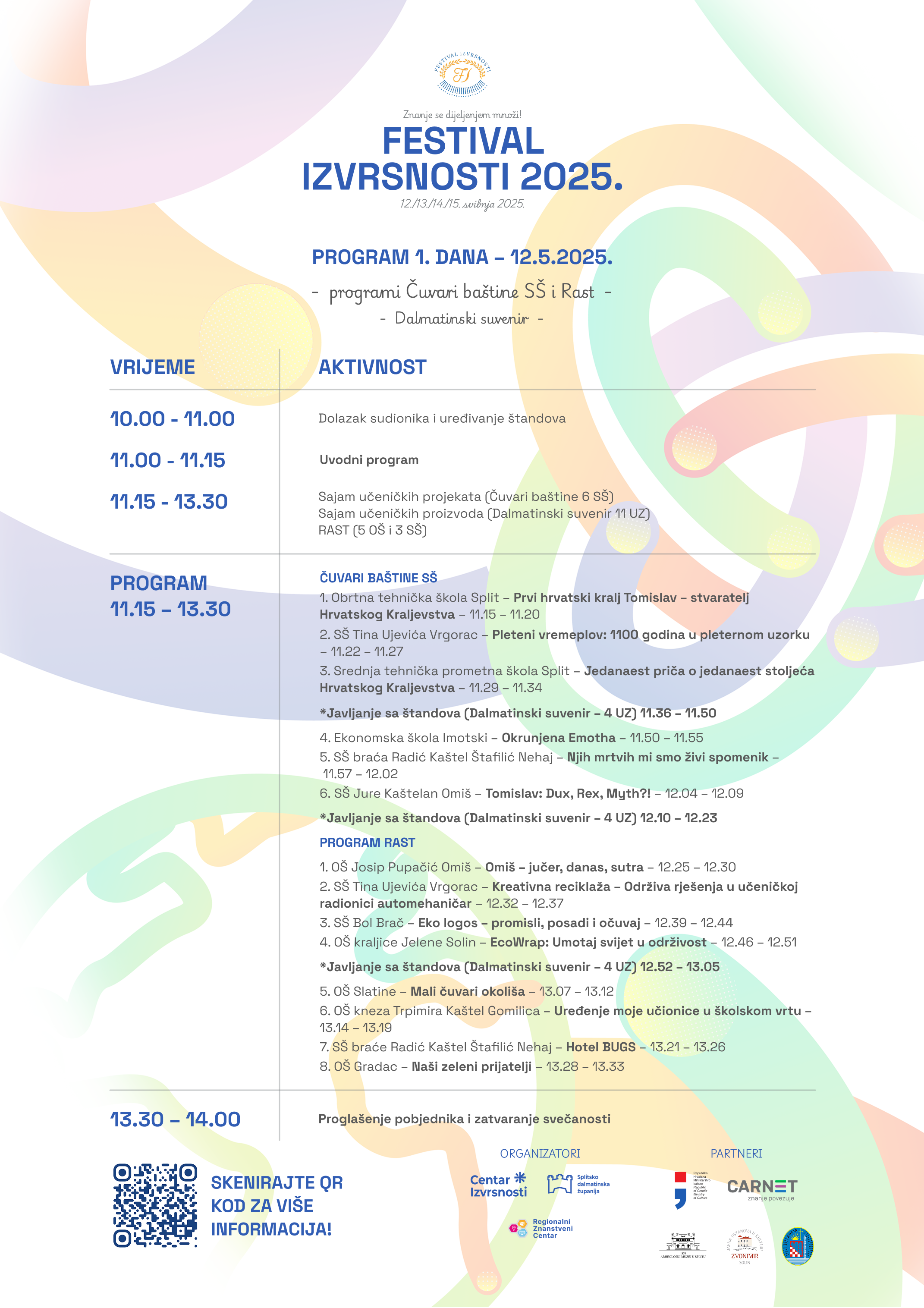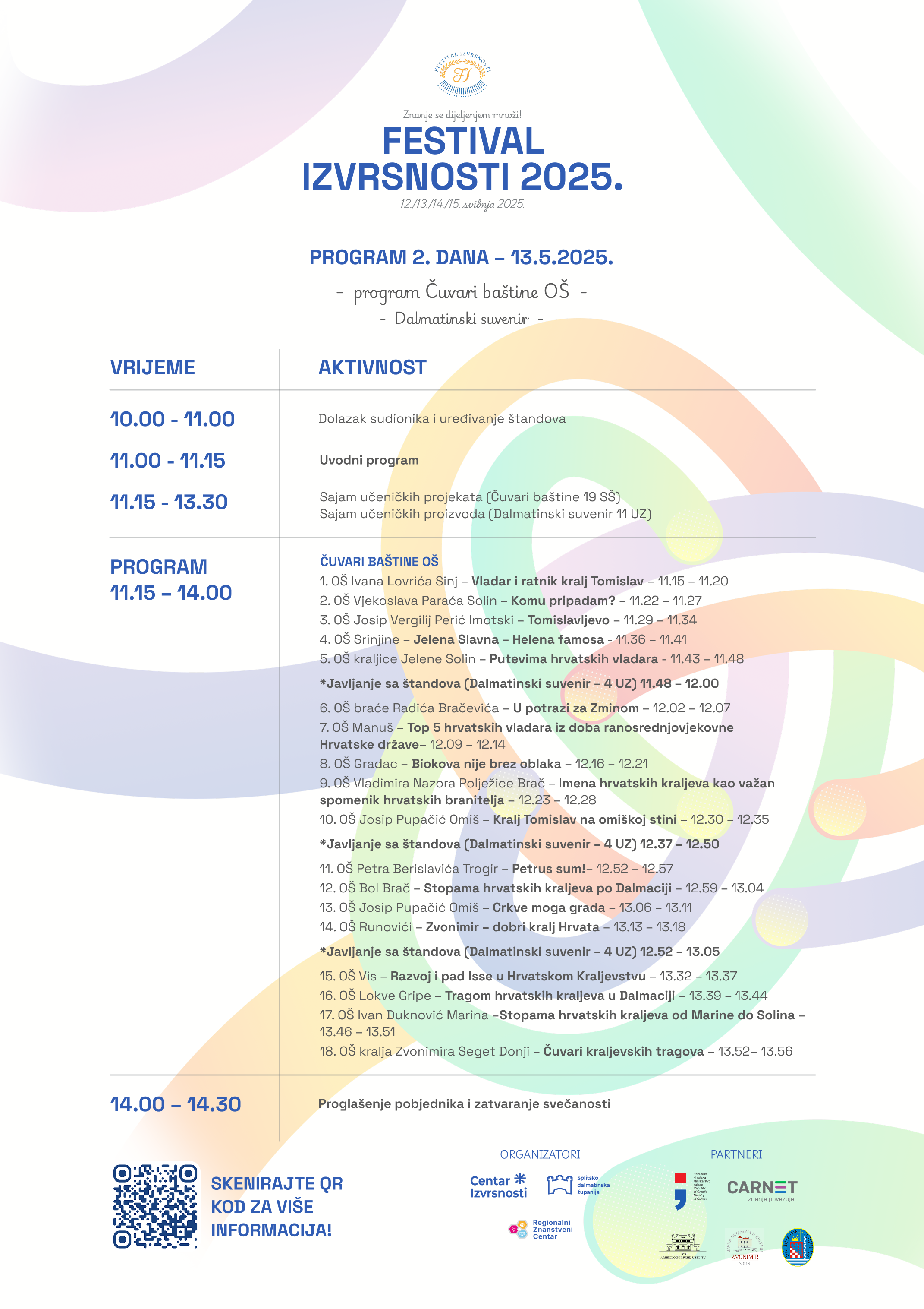 Na Festivalu će se predstaviti projekti osnovnih i srednjih škola unutar programa Čuvari baštine, Dalmatinski suvenir, Rast, Mother Earth, RoboStart te CIMAJ.